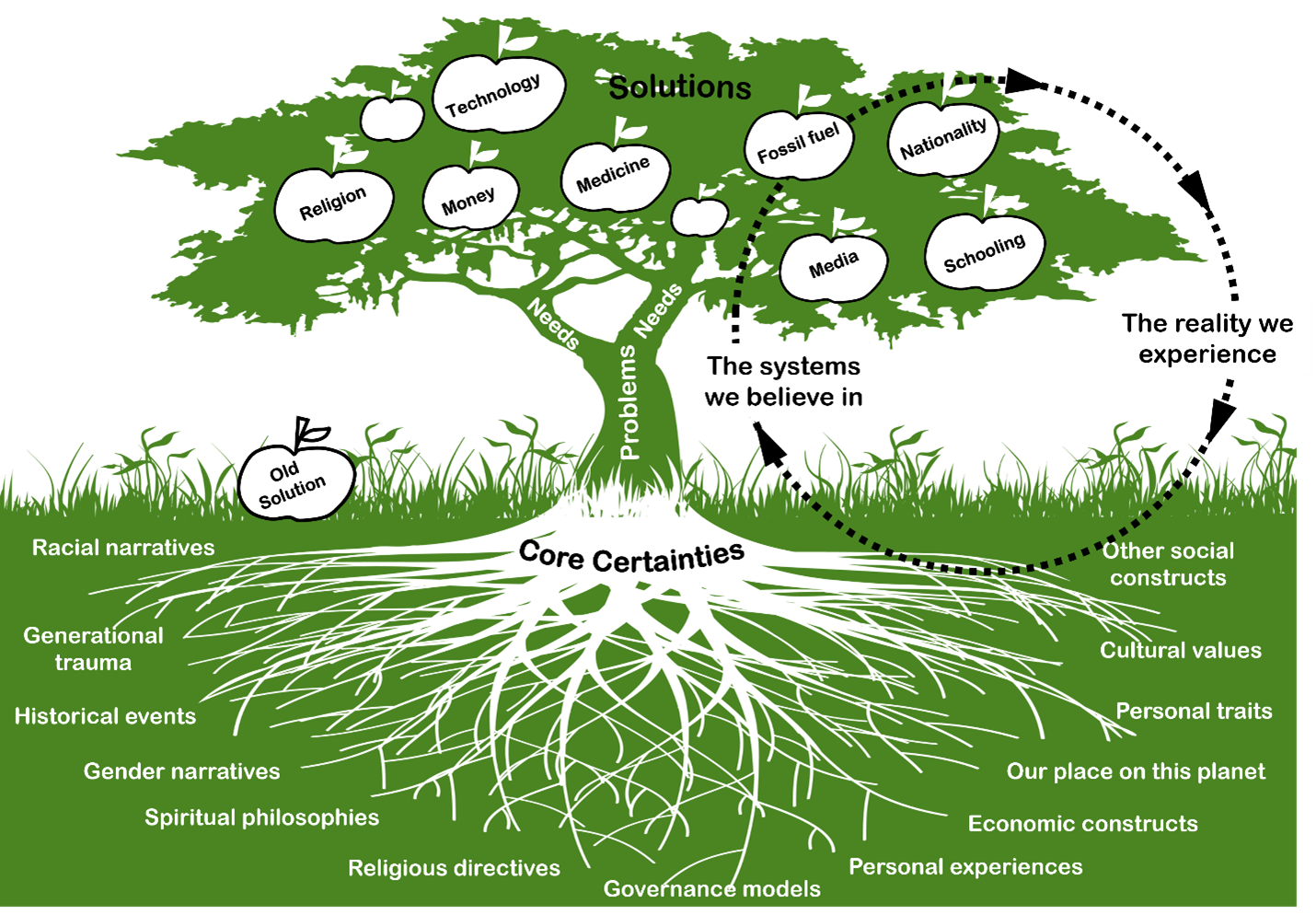 Beyond cooking principles, our Core Certainties shape the types of education our kids get, how we treat the natural world, how we define health and which healing methods we apply, the technologies we favour, the people we hate and discriminate, and the spiritual practices we uphold. Since our chosen Solutions will be based on our Core Certainties, they will act in a feedback loop, further strengthening our worldview. Solutions that we have abandoned, or that have evolved, will challenge, and eventually change our Core Certainties.